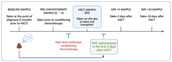 Timeline of longitudinal stool collection and FMT delivery relative to high dose melphalan conditioning chemotherapy and HSCT in the study participants. Image created using Biorender.