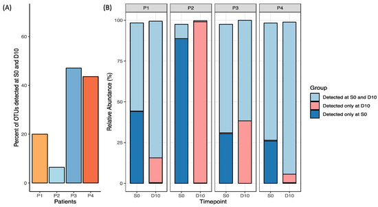 Relative OTU abundance in each participant’s S0 and D10 sample plotted as (A) percentage of OTUs detected in both S0 and D10 (engraftment), and (B) groups detected at S0 and D10, D10 only and S0 only relative to one another (excluding taxa < 0.1% abundance).