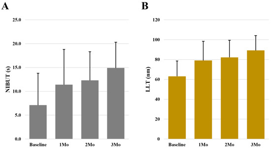 Of the ocular surface parameters assessed, NIBUT, LLT, TBUT, and CFS improved significantly during the treatment period in Group 1 (p < 0.05; Table 2). The most significant improvements were in NIBUT scores, which showed an average increase of 7.8 s after 3 months of treatment (Figure 1A), and in LLT, which improved by an average of 26.1 nm after 3 months of treatment (Figure 1B).