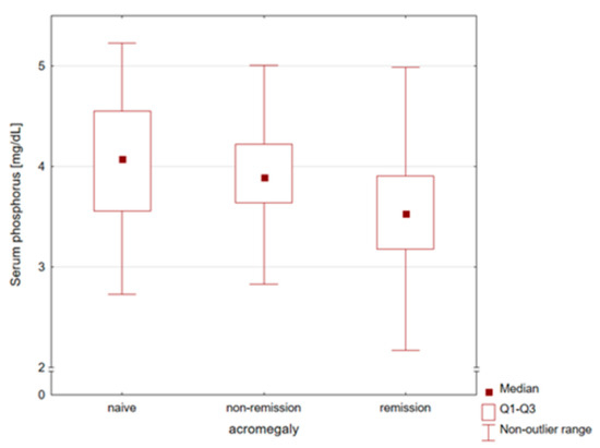 - Yalin, G.Y.; Tanrikulu, S.; Gul, N.; Uzum, A.K.; Aral, F.; Tanakol, R. Utility of Baseline Serum Phosphorus Levels for Predicting Remission in Acromegaly Patients. J. Endocrinol. Investig. 2017, 40, 867–874. [Google Scholar] [CrossRef]