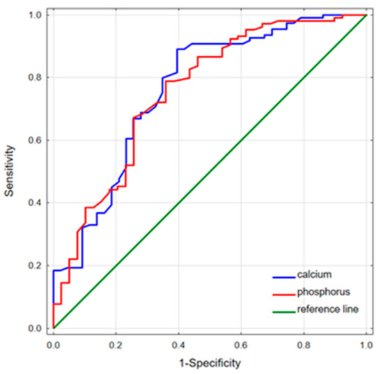 ROC curves for serum calcium and phosphorus discriminating the remission group from the naïve patients. Phosphorus predictive values: AUC = 0.755; cut-off (Youden’s Index), 3.98 mg/dL (sensitivity 0.788, specificity 0.641); calcium predictive values: AUC = 0.763; cut-off (Youden’s Index), 9.88 mg/dL (sensitivity 0.890, specificity 0.605).