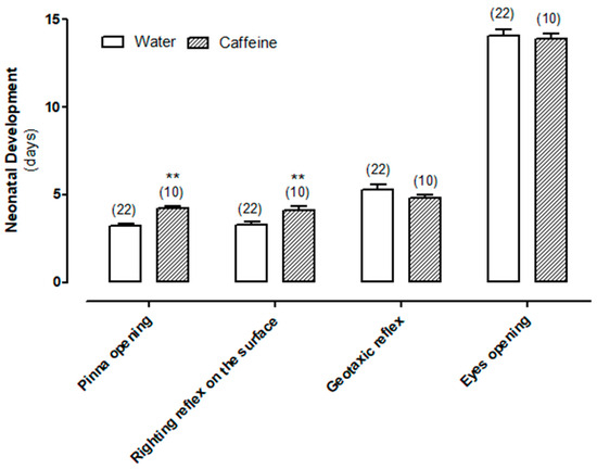 To assess the potential impact of chronic maternal caffeine intake on neonatal development, we compared the onset of various parameters between the group of neonates exposed to maternal caffeine and the control group whose mothers consumed water. As shown in Figure 1, pinna opening (3.2 ± 0.1 vs. 4.2 ± 0.1 days, p < 0.01) and righting reflex on the surface (3.3 ± 0.2 vs. 4.1 ± 0.2 days, p < 0.01) were significantly delayed in the caffeine-treated group. However, no significant differences were observed when the geotaxic reflex and eye opening were analyzed.