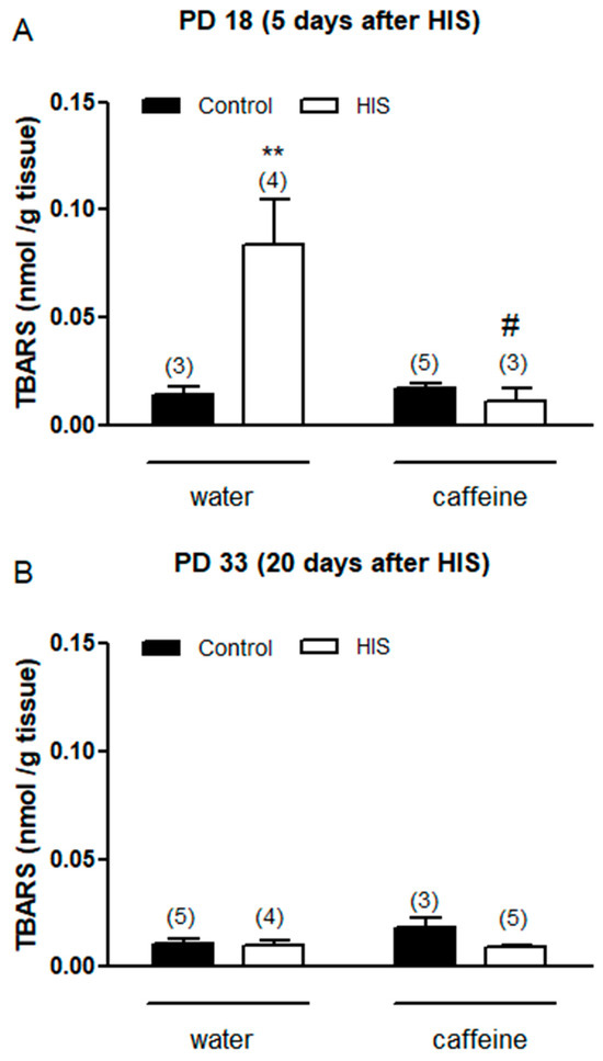 The impact of hyperthermia-induced seizures (HIS) and maternal caffeine consumption (1 g/L) during gestation and lactation on TBARS levels in the neonatal cortex (PD18 and PD33) was assessed at 5 (A) and 20 days (B) post hyperthermia-induced seizures. The bar graphs depict the influence of HIS on TBARS levels measured in the cortex of neonates born to mothers who consumed either water or caffeine during gestation and lactation. The data represent mean ± S.E.M. values of 3–5 neonates (in parentheses) from independent litters. ** p < 0.01 indicates a significant difference from the corresponding water control group, and # p < 0.05 indicates a significant difference from the water HIS group, as determined with two-way ANOVA and Bonferroni post hoc test. The control group comprises pups not exposed to hyperthermic stimulus but separated from the dams for the same duration and placed in a chamber at room temperature. HIS denotes pups subjected to hyperthermia-induced seizures as described in Methods.