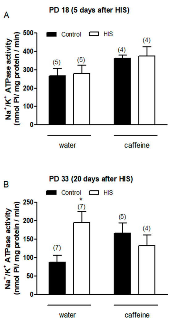 The impact of hyperthermia-induced seizures (HIS) and maternal caffeine consumption (1 g/L) during gestation and lactation on Na+/K+-ATPase activity was assessed in the neonatal cortex (PD18 and PD33) at 5 (A) and 20 days (B) post hyperthermia-induced seizures. Bar graphs illustrate the effect of HIS on Na+/K+-ATPase activity measured in the cortex of neonates born to mothers who consumed either water or caffeine during gestation and lactation. Data represent mean ± S.E.M. values from 4 to 7 neonates (in parentheses) in independent litters. * p < 0.05 indicates a significant difference from the corresponding water control group, as determined with two-way ANOVA and Bonferroni post hoc test. The control group consists of pups not exposed to hyperthermic stimulus but separated from the dams for the same duration and placed in a chamber at room temperature. HIS refers to pups exposed to hyperthermia-induced seizures as described in Methods.