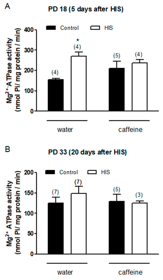 We also wanted to learn about the effect of HIS and chronic maternal caffeine intake on Mg2+-ATPase activity. The two-way ANOVA analyses revealed that 5 days after hyperthermic insult, HIS caused a significant change in Mg2+-ATPase activity in the control group [F(1,13) = 7.75, p = 0.0155]. However, statistical analyses did not find any significant effect of maternal caffeine intake [F(1,13) = 0.19, p = 0.67] or caffeine × HIS interaction [F(1,13) = 3.06, p = 0.104]. The Bonferroni post-test showed that HIS significantly increased the activity of Mg2+-ATPase level in control rats (p < 0.05) (Figure 5A).