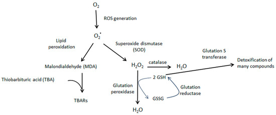 Schematic diagram showing the cascade of oxidative stress and the role played by TBARs, glutathione reductase, and glutathione S transferase. O2* represents superoxide ion.