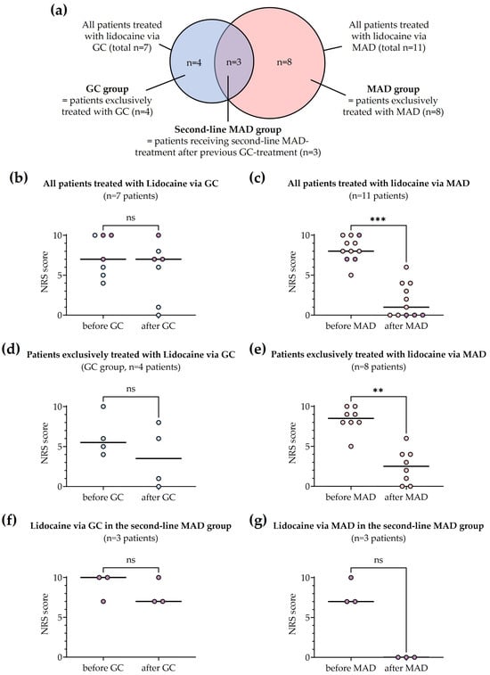 Reduction in pain scores (NRS) after first dose of intranasal lidocaine 2%. Colors indicate the different groups: Patients exclusively treated with lidocaine via GC (blue), patients exclusively treated with lidocaine via an MAD (light red) and patients first treated with lidocaine via GC, followed by administration via an MAD (purple). (a) Venn-diagram showing the distribution of treatments among patients. (b) All patients treated with lidocaine via GC (n = 7 patients; p = 0.13). (c) All patients treated with lidocaine via an MAD (n = 11 patients; p = 0.001). (d) Patients exclusively treated with lidocaine via GC (n = 4 patients; p = 0.25). (e) Patients exclusively treated with lidocaine via an MAD (n = 8 patients; p = 0.0078). (f) Patients receiving lidocaine via GC in the second-line MAD group (n = 3 patients; p > 0.99). (g) Patients receiving lidocaine via an MAD in the second-line MAD group (n = 3 patients; p = 0.25). Abbreviations: GC gauze compresses, MAD mucosal atomization device, NRS numeric rating scale. Horizontal lines represent the median of each group. Differences in group comparisons are marked with ‘**’ (p values ≤ 0.005), ‘***’ (p values ≤ 0.001) or ‘ns’ (not significant), respectively.