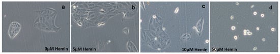 Cytotoxicity of heme (hemin) assessed by live cell morphology. Cells were plated in DMEM media with 10% FBS and incubated with varying concentrations (0, 5, 10, and 50 µM) of hemin for 18 h. Changes in morphology was assessed using an ImageXpress Pico Microscopy system. No change in podocyte morphology was observed at concentrations below 50 µM (panels a–c). Concentrations on 0, 5 and 10 µM were, therefore, deemed as non-cytotoxic. Cell rounding was observed at hemin concentration of 50 µM (d).