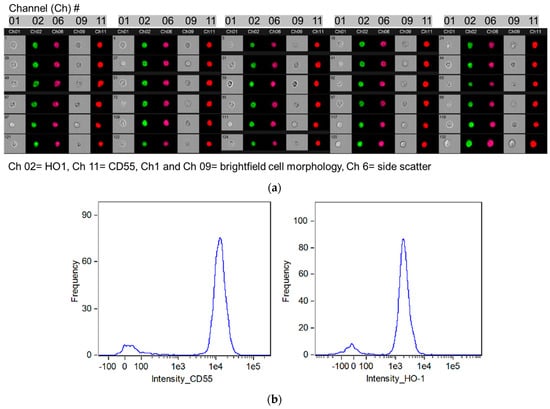 (a) Flow cytometry image gallery: Constitutive HO-1 and CD55 expression in podocytes. Cultured podocytes were fixed and permeabilized with 4% formaldehyde solution. Cells were then directly stained with an AF (Alexa Fluor) 647-conjugated anti-rat HO-1 antibody at a 1250-fold dilution and a FITC-conjugated anti-rat CD55 antibody at a 2000-fold dilution. Antibody incubations were for 30 min at 22 °C followed by flow cytometry using the Amnis FlowSight imaging cytometer (Luminex Corporation, Austin, TX, USA) that detects brightfield cell morphology (channels 01 and 09 in figure above), darkfield and fluorescent images (FITC in channel 02, AF647 in channel 11 in figure above). Side scatter, a measure of internal complexity (i.e., granularity) of interrogated cells, was also assessed (channel 06). Events captured were 5000 for samples with either AF647-conjugated anti-rat HO-1 antibody or FITC-conjugated anti rat CD55 antibody, 1000 in compensation sample for each of these conjugated antibodies and 5000 for unstained sample. Constitutive expression of both HO-1 and CD55 was observed (channels 02 and 11). (b) Histogram showing results of flow cytometry analysis: intensity of staining of podocytes incubated with FITC-conjugated anti-rat CD55 antibody (left panel) and of AF647 conjugated anti-rat HO-1 antibody (right panel) plotted against number of cells interrogated.