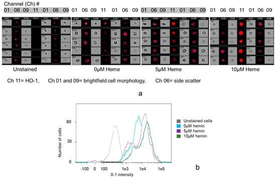 (a) Flow cytometry image gallery: Assessment of HO-1 inducibility by heme in cultured podocytes. At completion of incubations with heme (0, 5 and 10 µM for 24 h), cells were fixed and permeabilized with 4% formaldehyde solution followed by direct staining (30 min at 22 °C) with AF647 conjugated anti-rat HO-1 antibody at 1250-fold dilution and flow cytometry. Channels 01 and 09 in figure above: bright field cell imaging/morphology; Chanel 11: cells stained with the AF647 conjugated anti-HO-1 antibody; Channel 06: side scatter (SSC) reflecting internal complexity/morphology of interrogated cells. A total of 5000 events were captured for each of AF647-conjugated anti-rat HO-1 antibody-stained samples and for unstained sample (control). Heme concentration-dependent increase in HO-1 expression was observed. (b) Composite histogram representing gated cell populations. Gray histogram: podocytes not stained with the anti-rat HO-1 antibody. Turquoise histogram: podocytes incubated with 0 µM of hemin and stained with the anti-rat HO-1 antibody. Purple histogram: podocytes incubated with 5 µM of hemin and stained with the anti-rat HO-1 antibody. Green histogram: podocytes incubated with 10 µM of hemin and stained with the anti-rat HO-1 antibody. Shift of histogram curve to the right in response to increasing hemin concentrations indicative of HO-1 induction.
