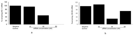 We next assessed constitutive expression of HO-1 and CD55 in cultured podocytes. As constitutive CD55 protein expression in the rat nephron is restricted to podocytes [], detection of this complement regulatory protein at mRNA and protein levels in cultured podocytes is expected. In contrast, of the two HO isoforms, the inducible (HO-1) is predominantly found in the liver and spleen [], while the constitutive (HO-2) is mainly found in the brain and testes [,]. Verification of presence of HO-1 protein in cultured podocytes and inducibility by its natural HO substrate, heme, at sub cytotoxic concentration was, therefore, necessary and was assessed by flow cytometry. As shown in Figure 3a,b, cultured podocytes constitutively expressed both proteins. In addition, the HO-1 protein was inducible by hemin (Figure 4a,b), which dose-dependently increased transcription of both HO-1 and CD55 (Figure 5).