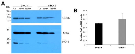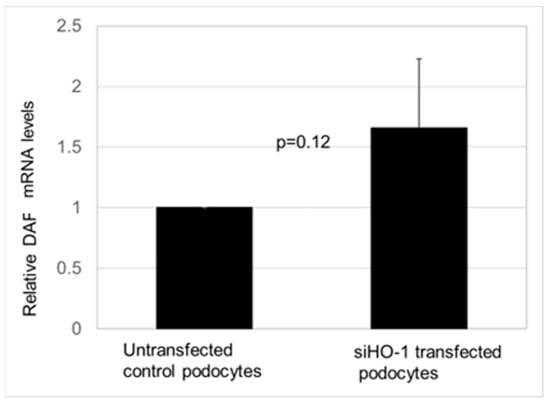 Effect of constitutive HO-1 silencing of basal CD55 (DAF) mRNA levels. In podocytes transfected with HO-1 RNAi duplex-Lipofectamine RNAiMAX complexes to silence HO-1, there was no statistically significant change in CD55 (DAF) mRNA.