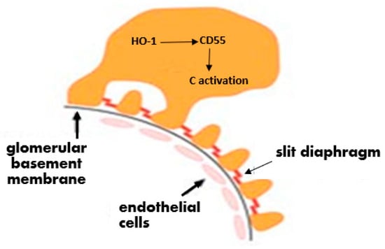 Podocytes are terminally differentiated cells of the glomerular microvasculature and most vulnerable to injury following exposure to locally (intraglomerular) or systemically generated noxious conditions. These include cytokines and pro-oxidant radicals such as superoxide (O2−), hydrogen peroxide (H2O2) and peroxynitrite (ONOO−) overproduced in inflammatory processes and also free heme released following systemic or intraglomerular hemolysis, as can occur in aggressive forms of glomerulonephritis associated with hematuria or hemoglobinuria. Although concentrations of “free” heme attained within glomeruli are unknown, in hemolytic diseases, as exemplified by hemolytic uremic syndrome, heme concentrations ranging from 20 to 50 µM have been reported []. At these concentrations, heme has cytotoxic effects including activation of the alternative complement pathway in plasma and the release of C3a, C5a and soluble C5b-9 (membrane attack complex, MAC) proteins of the complement activation cascade. It also enhances cell membrane binding of C3 and C5b-9 [], the latter of which disrupts continuity of the cell membrane. However, heme also activates mechanisms of cellular self-defense key among which is HO-1 induction which degrades heme, thereby preventing it from rising to cytotoxic concentrations, and also converts heme into the cytoprotective breakdown products biliverdin and carbon monoxide (CO). In vivo studies demonstrated that HO-1 induction in podocytes also upregulates the complement regulatory protein, CD55, thereby reducing C3 deposition and attenuating the extent of complement-dependent glomerular injury []. However, HO-1 induction in these studies was achieved using targeted overexpression of the protein in podocytes of transgenic rats [], and this “forced” HO-1 overexpression had long-term adverse effects on podocyte structural/functional integrity [].