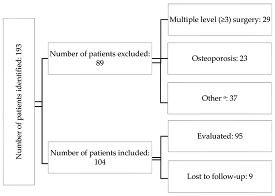 A single-center, observational study was conducted with 104 patients operated on at the authors’ center between 2019–2021 for cervical disc disease. Inclusion criteria were as follows: diagnosed cervical degenerative disc disease on preoperative MRI that did not respond to conservative treatment, age ≥ 18, and eligibility for single- or double-level ACDF surgery. Exclusion criteria included ages younger than 18 years, comorbidities that disqualified the patients from surgery, diagnosed osteoporosis, and those requiring three or more levels of surgery. During the study period, a total of 193 individuals were evaluated, of which 104 met the study criteria. As 9 patients were lost during follow-up, the images from the remaining 95 were assessed (Figure 1). The subjects’ mean age was 51, with a median of 50. The youngest participant was 31, while the eldest was 71. Among the participants, 67 (71%) were women (Table 1).