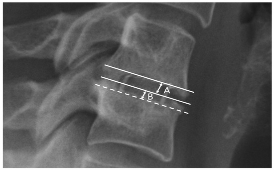 Assessment method for implant subsidence in fused vertebrae: B—subsidence depth; A—intervertebral height. Subsidence was defined as (B/A) ≥ 0.3.