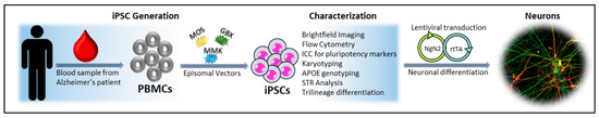 - Das, D.; Li, J.; Liu, S.; Oh, E.; Cheng, L.; Lyketsos, C.; Mahairaki, V. Generation and characterization of a novel human iPSC line from a resilient Alzheimer’s disease patient. Stem Cell Res. 2020, 48, 101979. [Google Scholar] [CrossRef]