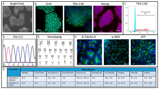 Characterization of a novel iPSC line from an AD patient with NPS. (A) iPSC morphology using bright field microscopy (scale bar: 400 µm). (B) Immunostaining using pluripotency markers OCT4, TRA-1-60, and Nanog (scale bar: 100 µm). (C) Purity of human TRA-1-60+ cells as seen via flow cytometry. (D) Genotyping using DNA sequencing. (E) Chromosome Analysis using Karyotyping. (F) Immunostaining for Trilineage differentiation capacity using Endoderm (AFP), Mesoderm (α-SMA), and Ectoderm (β-tubulin III) markers (scale bar: 100 µm). (G) Short tandem repeat (STR) profiling analysis between newly generated iPSC line and parental PBMC.