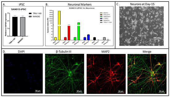 Characterization of neurons derived from the hiPSC (SAN013) line from AD patients with NPS. (A) Gene expression using qPCR for the pluripotency of iPSC (TRA-1-60 and NANOG). (B) Gene expression of neuronal markers (MAP2, VGLUT, NMDAR1, and CTIP2) to show neuronal identity. (C) Neuronal morphology using bright field microscopy (scale bar: 400 µm). (D) Representative immunostaining of β-Tubulin III (TUJ1) and MAP2-positive neurons on day 15 (scale bar: 50 µm).