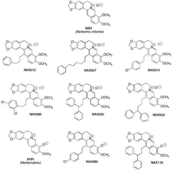Berberine (BBR—chloride form, Trust & We, Shanghai, China), berberrubine (BRR), and analogs NAX012, NAX014, NAX035, NAX053, NAX057, NAX060, NAX085, and NAX118 were provided by Naxospharma (Figure 1). The purity (>95%) of the derivatives was previously assessed [51,52].