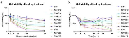 To evaluate the in vitro antiproliferative effect of BBR, BRR, and analogs (Figure 1) on CF33 cells, we measured cell viability after treatment. In the first experiment, cells were treated with BBR and analogs for 24 h using different dosages (2 μM, 5 μM, 10 μM, 20 μM, and 40 μM) (Figure 2a). The half maximal inhibitory concentration (IC50) was analyzed for each compound and is reported in Table S1. Consequently, we performed a second cell viability assay at different time points, using a dosage of 10 μM for all the compounds (Figure 2b). In this experiment, cells were treated with each drug at the dosage of 10 μM, and cell viability was measured at different times (3, 6, 12, 15, 18, and 24 h) (Figure 2b). Treatments with BBR, BRR, and analogs exerted a dose- and time-dependent inhibition of cell viability (Figure 2).