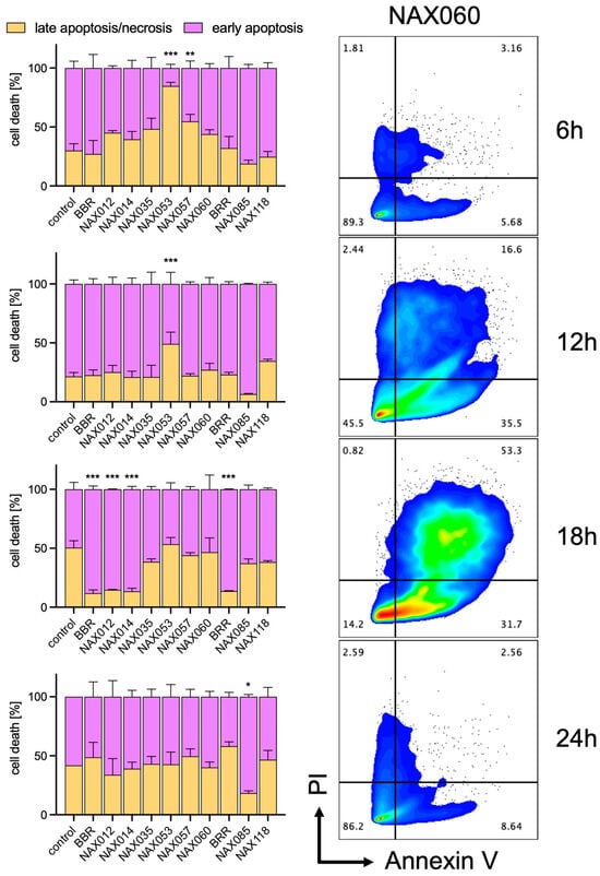 Next, we investigated whether the cytotoxic effects of BBR and analogs were due to apoptotic or necrotic cell death. CF33 cells were exposed to 10 μM of each drug, and early apoptosis and late apoptosis/necrosis were measured after 6, 12, 18, and 24 h of treatment by flow cytometry (Figure 3). From 6 to 12 h, an increased rate of early apoptosis versus necrosis was observed for most drugs (e.g., BBR, NAX012, NAX014, NAX035, NAX053, NAX057, NAX060, BRR, NAX085) (Figure 3). From 12 to 18 h, while some drugs (e.g., BBR, NAX012, NAX014, BRR) showed an even higher rate of early apoptosis versus necrosis, other drugs (e.g., NAX035, NAX053, NAX057, NAX060, NAX085) showed an increased rate of late apoptosis/necrosis. After 6 h, NAX053 and NAX057 induced a significantly higher amount of late apoptosis/necrosis when compared to the control (DMSO-treated cells). Similarly, after 12 h, treatment with NAX053 resulted in a significantly higher amount of late apoptosis/necrosis when compared with the control. After 18 h, BBR, NAX012, NAX014, and BRR induced a significantly higher amount of early apoptosis when compared with DMSO-treated cells. Finally, after 24 h, NAX085 caused a significantly higher amount of early apoptosis than control cells (Figure 3). Altogether, these data show a different time-dependent induction of apoptosis/necrosis among the different compounds.