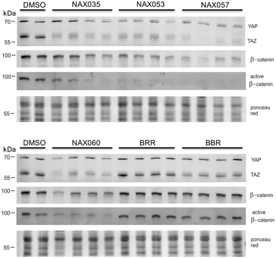 Protein expression after drug treatment. Representative cropped Western blots of YAP/TAZ, β-catenin and active β-catenin in protein lysates obtained from CF33 cells treated with berberine (BBR), NAX035, NAX053, NAX057, NAX060 and berberrubine (BRR) for 24 h. Bands of the expected sizes for YAP (~70 kDa), TAZ (~55 kDa), β-catenin (~92 kDa) and active β-catenin (~92 kDa) are present in all samples. The experiment was performed in quadruplicate. Each lane corresponds to a replicate. Ponceau red was used as a loading control.