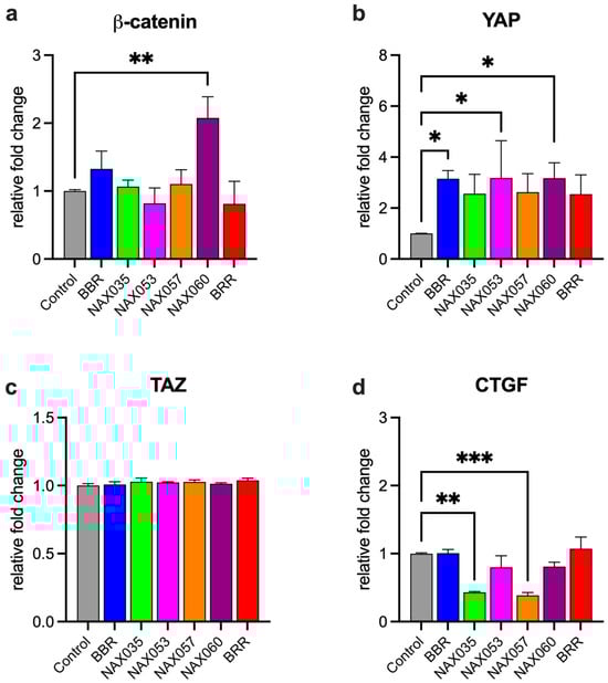 We focused on genes specifically involved in the Wnt/β-catenin and Hippo pathways. β-catenin mRNA expression was not significantly altered after treatment with NAX035, NAX053, NAX057 and BRR in comparison with cells treated with BBR and control. β-catenin mRNA expression was significantly higher (p < 0.01) in cells treated with NAX060 when compared to the control (Figure 5a).