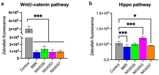 Interestingly, Hippo pathway reporter animals showed a lower fluorescence when treated with BBR (p < 0.001), NAX035, and NAX057 (p < 0.05) when compared to the control (Figure 6b), while transgenic embryos treated with NAX053 showed an increased fluorescence compared to untreated siblings (p < 0.0001) (Figure 6b).
