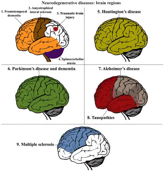 - Wilson, D.M.; Cookson, M.R.; Van Den Bosch, L.; Zetterberg, H.; Holtzman, D.M.; Dewachter, I. Hallmarks of Neurodegenerative Diseases. Cell 2023, 186, 693–714. [Google Scholar] [CrossRef] [PubMed]