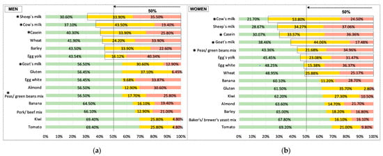 Food-specific IgG4 AbRs in Spanish men and women. (a) Prevalence of food-specific IgG4 AbRs in men, (b) prevalence of food-specific IgG4 AbRs in women. Green color: Level 1, low, food-specific IgG4 AbRs. Yellow color: Level 2, moderate, food-specific IgG4 AbRs. Red color: Level 3, high, food-specific IgG4 AbRs. * p < 0.05.