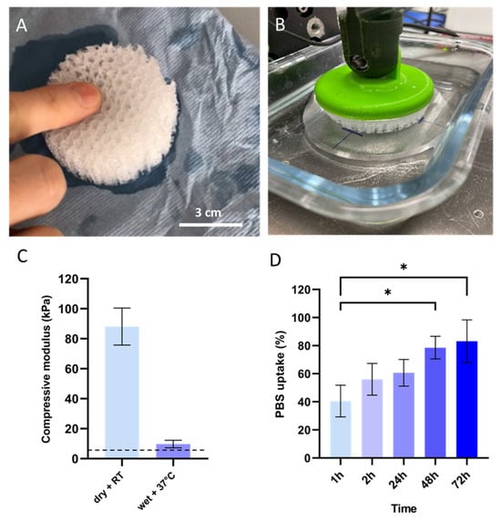Mechanical characterization of the 3D-printed PLCL scaffold. (A) Visual appearance of scaffold compression after immersion in PBS at 37 °C; (B) Experimental set-up of the compression tray with the scaffold specimen in a 37 °C bath; (C) Compressive modulus of the 3D-printed PLCL scaffold in different conditions: dry at room temperature (RT) and wet at 37 °C for 5 min, data represented as mean ± SD (n = 3). The reference compressive modulus of human adipose tissue is indicated by a horizontal dashed line; (D) PBS uptake of the scaffold specimens after 1, 2, 24, 48, and 72 h in PBS at 37 °C. Data are presented as mean ± SD (n = 3); * p < 0.05.
