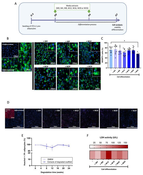 We cultured 3T3-L1 preadipocytes (ATCC-CL-173 from ATTC, Manassas, VA, USA) in DMEM High Glucose medium (Gibco, Thermofisher, Illkirch-Graffenstaden, France) with 10% FBS (Eurobio scientific, Les Ulis, France) and 1% PS (Gibco, Thermofisher, Illkirch-Graffenstaden, France) at 37 °C, 5% CO2. After reaching 80% confluence, cells were rinsed using PBS (Thermofisher) and detached with 0.25% trypsin-EDTA (Thermofisher). Pre-adipocytes were seeded at a density of 3 × 103 cells/cm2 in a 24-well plate (1 mL/well). Differentiation was induced in confluent cells (at D0 3 days after seeding) by replacing DMEM with differentiation medium. Differentiation of 3T3-L1 was initiated in DMEM complete medium using an adipocyte differentiation cocktail containing 1 µM Dexamethasone, 0.5 mM 3-Isobutyl-1-methylxanthine, and 10 µg/mL human insulin, all sourced from Sigma-Aldrich, St. Louis, MO, USA. After 4 days (D4), cells were switched to DMEM complete medium supplemented with 10 µg/mL insulin for an additional 3 days. Throughout this 7-day period of differentiation, 1 mL of media extracts from degraded scaffolds was added at D0 and D4 of differentiation. At D7 of differentiation, cell supernatants were recovered for analysis. Additionally, cells were prepared for the quantification of differentiation and adipocyte viability.