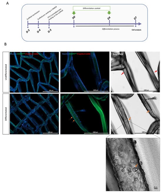Cell attachment on 3D-printed PLCL scaffolds after 7 days. (A) Experimental protocol (see material and methods for details). (B) Representative images of undifferentiated (upper line) or differentiated (lower line) 3T3-L1 cells onto PLCL scaffolds after staining with Hoechst (blue), BODIPY 493/503 (green), and propidium iodide (red). Arrows show cells attached to scaffold after 7 days. Note the presence of lipid vesicles in the adipocytes attached to the filaments on the high-magnification image (lower panel).