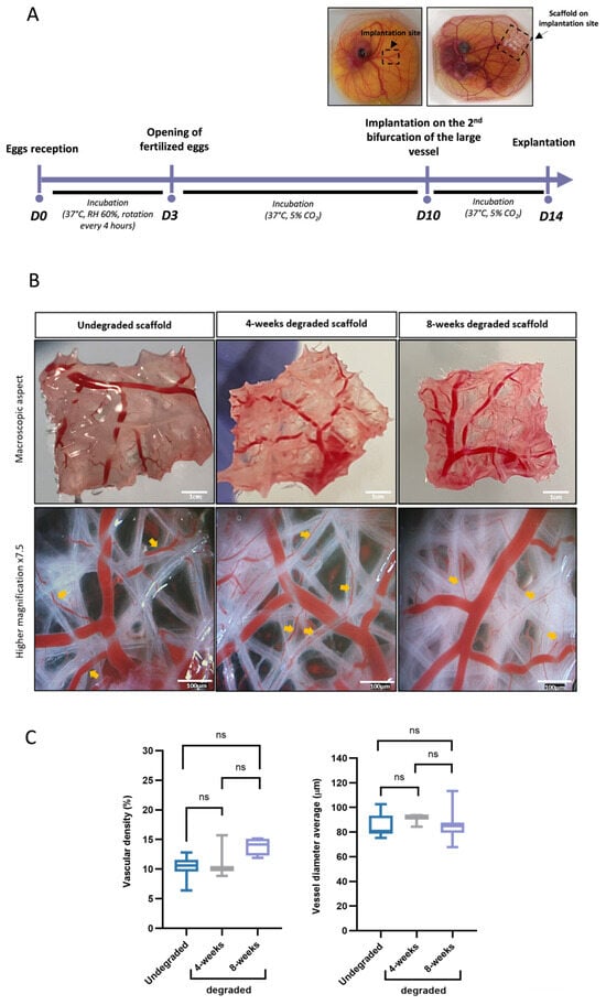 Sterile pre-degraded and undegraded scaffolds (1.5 × 1.5 cm) were implanted into chicken chorioallantoic membranes (CAM). Fertilized eggs were received and incubated in an automatic incubator (JANOEL24, Wiltec Wildanger Technik GmbH, Eschweiler, Germany) for 3 days in conditions of 37 °C and 60% humidity. They were then opened. Scaffolds, rinsed with PBS, were implanted at day 10 of embryonic development into the CAM for 4 days. Images were taken using a Motic binocular loupe SMZ-171 (Motic, Wetzlar, Germany) equipped with a Moticam 1080. Vascular density and vessel diameter were quantified using ImageJ 1.53t software (National Institutes of Health, Bethesda, MD, USA).