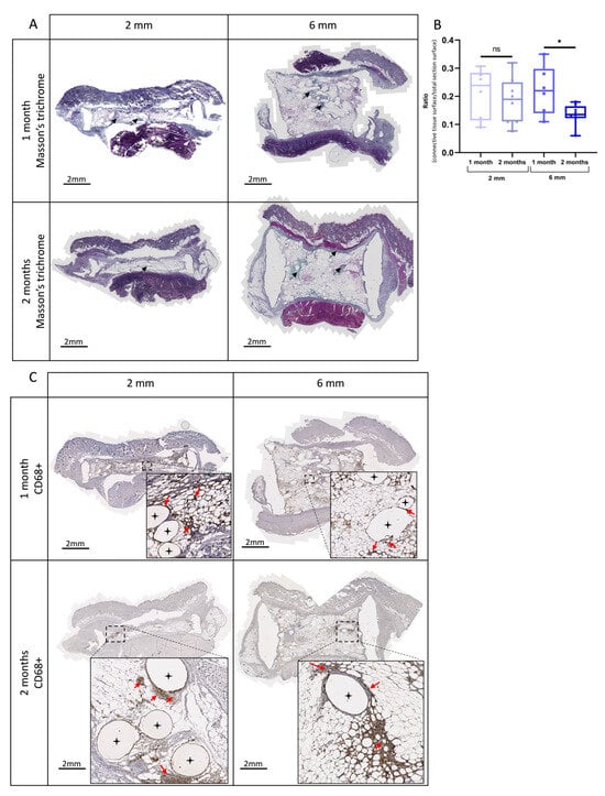 Histomorphometric analyses of connective tissue and macrophage infiltration inside the scaffolds after 1 and 2 months of implantation. (A) Representative images of Masson’s trichrome-stained tissue inside the scaffolds at 1 and 2 months after implantation. Dark blue areas indicate collagen fiber deposition (black arrows); (B) Relative quantification of connective tissue. Ratios of connective tissue to the overall surface inside scaffolds at 1 and 2 months after implantation were estimated. The whisker bar graphs indicate median, 5–95 percentile max–min, n ≥ 6, * p = 0.0320, ns p > 0.05; (C) Representative immunostaining images of infiltrating CD68+ macrophage inside the scaffolds (red arrows). Higher-magnification views of representative areas are also shown (brown coloration). Black stars indicate scaffold filaments.