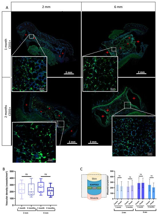 Characterization of the vascularization inside the scaffolds at 1 and 2 months after implantation. (A) Representative immunofluorescence images of CD31+ capillaries within adipose tissues inside the scaffolds. Red stars indicate scaffold pillars. Higher-magnification views of representative areas are also shown; (B) Quantification of CD31+ cells per mm2 (vascular density) inside the scaffolds after 1 and 2 months of implantation. Data are expressed as whisker bar graphs (median, 5–95 percentile max–min), n ≥ 6, ns p > 0.05; (C) Comparison of vascular density between different areas (center or on the periphery) of adipose tissue within scaffolds after 1 and 2 months of implantation. Data are presented as bar graphs (mean ± SD), n = 3, ns p > 0.05.