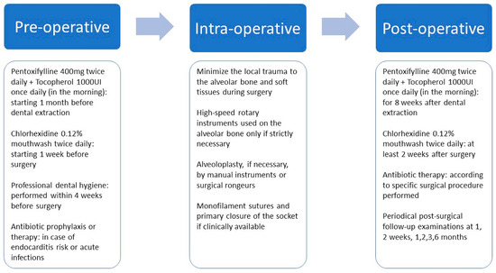The PENTO protocol has been proposed as a prophylactic therapy for ORN in patients requiring oral surgery procedures after undergoing head and neck RT, but very few data are available [84]. To the best of our knowledge, only three clinical studies had evaluated the effectiveness of PENTO as a prophylactic therapy for ORN [78,85,86] using slightly different dosages from one study to another. Patel et al. and Aggarwal et al. reported ORN incidences after dental extractions in patients who previously underwent head and neck RT of 1.2% and 1.8%, respectively [85,86]. In both studies, pentoxifylline 400 mg twice daily and tocopherol 1000 IU daily were prescribed starting from 1 month before surgery, then continued after the intervention until complete socket healing [85,86]. Lombardi et al. reported an ORN incidence of 5.6% after the administration of pentoxifylline 400 mg twice a day and tocopherol 800 IU once a day, starting from 1 week before the surgical procedure and continuing 8 weeks after [78]. The PENTO protocol was associated with antibiotics prescription at variable rates among different studies: in 94% of cases in Patel et al., in 100% of cases in Aggarwal et al., while in only 48% of cases in Lombardi et al. [78,85,86]. Gathering the data from the literature, a suggested PENTO protocol for ORN prevention could be proposed, and it is described in Figure 2.