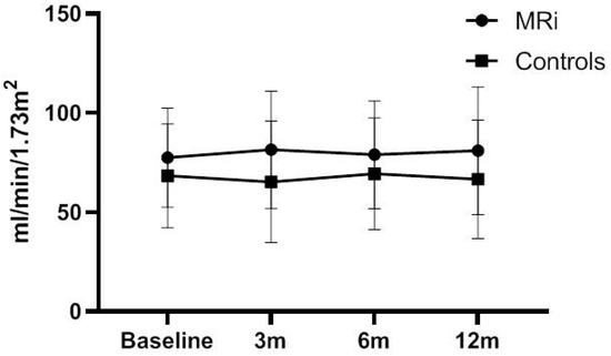 After 3 months of treatment with eplerenone, we observed no significant change in serum creatinine and eGFR. This trend of serum creatinine and eGFR preservation was also documented at both 6 and 12 months after initiation of treatment. Data concerning serum creatinine and eGFR in both groups of patients are presented in Table 4 and Figure 2. Differences of kidney function parameters between groups at different time points are presented in Supplemental Table S1.