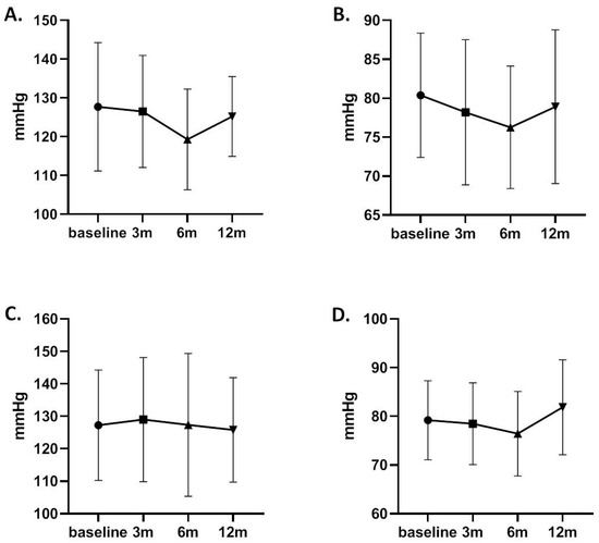 Systolic (A) and diastolic (B) blood pressures in patients treated with eplerenone and systolic (C) and diastolic (D) blood pressures in controls. m: months from the initiation of treatment.
