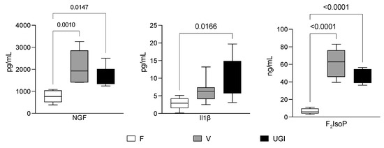 Nerve growth factor (NGF), interleukin 1β (IL-1β) and F2-isoprostane (F2IsoP) levels in the seminal plasma from fertile men (F) and men with varicocele (V) and urogenital infections (UGIs). The plots display the results obtained by enzyme-linked immunosorbent assays for NGF (image on the left) and IL-1β (image in the middle), and by gas chromatography/negative-ion chemical ionisation tandem mass spectrometry (GC/NICI-MS/MS) for F2IsoPs (image on the right). The data were analysed with one-way analysis of variance followed by the Tukey test for multiple comparisons (α = 0.05 and 95% confidence interval). The significant p values (<0.05) are indicated.