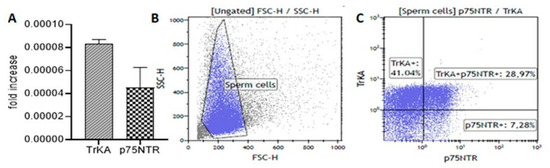 We detected both TrKA and p75NTR in sperm by using several methodological approaches (Figure 2). The TrkA mRNA level in sperm was twice as high as the p75NTR mRNA level (Figure 2A). Furthermore, flow cytometry showed a higher percentage of TrKA-positive sperm (70%) with respect to p75NTR-positive sperm (36%) (Figure 2B,C). Again, the TrKA level was consistently higher than the p75NTR level.