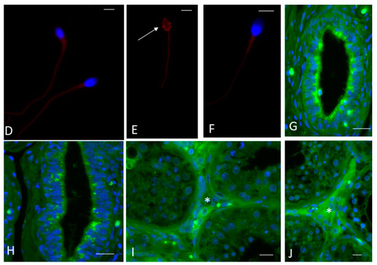 Immunofluorescence analysis confirmed the presence and localisation of TrKA and p75NTR receptors in ejaculated sperm. TrKA was localised in the tail and the post-acrosomal sheath of normal sperm (Figure 2D,E). There was weak p75NTR staining throughout the entire tail (Figure 2F). TrKA and p75NTR were also widely present in the epididymis (Figure 2G and 2H, respectively) and the interstitial tissue of the testis (Figure 2I and 2J, respectively).