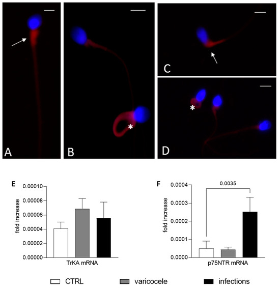 Nerve growth factor (NGF) receptors in altered sperm from men with infertility. (A–D) Fluorescence immunostaining of human sperm from men with infertility (varicocele (V) or urogenital infections (UGIs)) incubated with the anti-TrKA (A,B) and anti-p75NTR (C,D) antibodies. In (A) (sperm from the UGI group), the TrkA signal is evident in the midpiece of the sperm (arrow); in (B) (sperm from V group), there is staining in the midpiece and in the entire coiled tail (asterisk). In (C,D), p75NTR staining is strong in the midpiece and cytoplasmic residue (arrow, sperm from the V group) and in the entire coiled tail (asterisk) and midpiece ((D), from the UGI group). Bars: 5 µm. (E,F) The bar graphs show the mean and standard deviation of the fold change in the TrKA (E) and p75NTR (F) mRNA level for fertile men (n = 7, F, white bars), men with varicocele (n = 7, V, grey bars) and men with UGI (n = 7, black bars). One-way analysis of variance followed by the Tukey test was used for multiple comparisons (α = 0.05 and 95% confidence interval). The significant p value (<0.05) is indicated.
