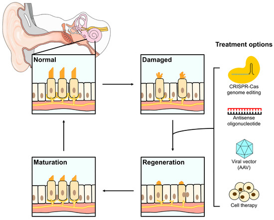 - Lee, M.Y.; Park, Y.-H. Potential of Gene and Cell Therapy for Inner Ear Hair Cells. Biomed. Res. Int. 2018, 2018, 8137614. [Google Scholar] [CrossRef] [PubMed]