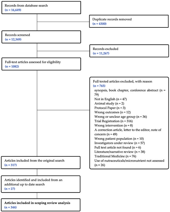 The initial search retrieved a total of 16,649 records, of which 4300 duplicates and 11,267 abstracts were excluded, leaving 1082 articles for potential inclusion. Of these, 765 articles were removed after the full-text assessment, including 57 studies that are currently under investigation for concerns regarding data integrity, leaving a total of 317 articles that met the inclusion criteria. An additional 27 articles were identified during the most recent search, resulting in a total of 344 articles included in this review. The results of the article selection process are presented in the PRISMA flow chart in Figure 1. Each paper was counted as a separate study.