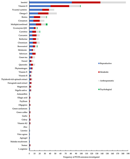 Therefore, this scoping review aimed to systematically map the available literature to identify the type and frequency of the use of nutraceutical and micronutrient supplementation for the management of PCOS features, including anthropometric, metabolic, reproductive and psychological. This review provides an overview of the breadth of the current available evidence and identifies existing gaps to direct future research, including the need for primary studies, systematic reviews and meta-analyses.