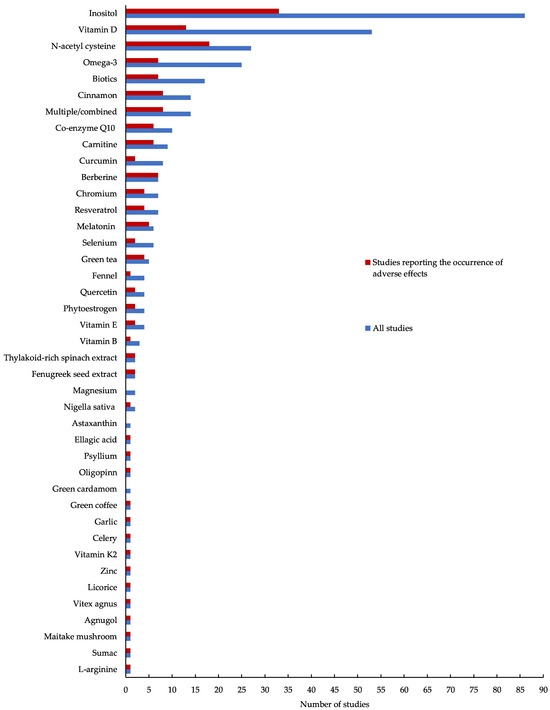 Forty-one different nutraceutical and micronutrient supplements were examined across the included studies. The most studied supplements included inositols (n = 86 studies), vitamin D (n = 53 studies) and N-acetylcysteine (n = 27 studies) (Figure 2). Across all studies, reproductive features were most commonly examined (n = 285; 82.8%), followed by metabolic (n = 229; 66.6%) and anthropometric (n = 197; 57.3%). Only eight studies (2.3%) reported on psychological outcomes. A total of 52 studies (15.1%) examined the potential efficacy of nutraceutical and micronutrient supplements on ART outcomes. Almost half (n = 161; 46.8%) of all studies included in the present review reported on the occurrence of adverse effects (Figure 3).