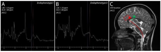 Spectroscopic spectrum. LAC–lactate-derived signal, ALA—alanine. (A) - Endophenotype I, (B) - Endophenotype II, (C) - VOI location.