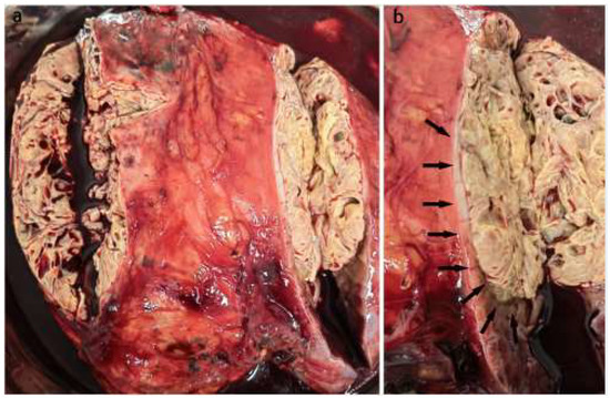 Gross appearance of one TFEB rearranged RCC. (a). The specimen of radical nephrectomy showed a huge round tumor, cystic solid, tan-yellow soft, and slightly heterogeneous cut surface. (b). The tumor was well-circumscribed and presented a partially dense fibrous pseudocapsule (arrowheads).
