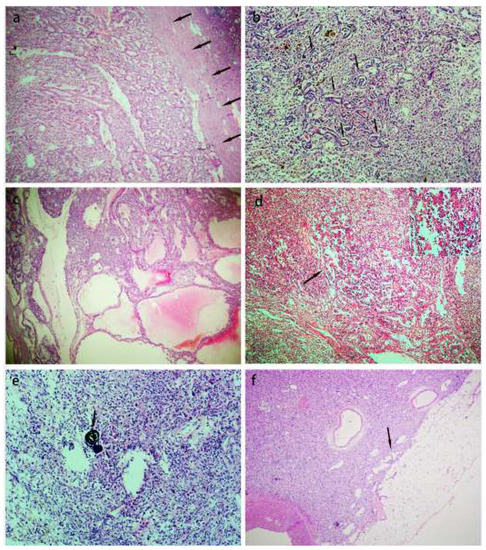 Architectural features of the TFEB rearranged RCC. (a). On low power, the tumors were most well-circumscribed and presented a thick fibrous pseudocapsule (arrowheads). (b). Entrapped non-neoplastic renal tubules could be presented in the tumors (arrowheads). (c). The tumor cells demonstrated a solid sheet, tubular growth pattern with local cystic changes. (d). A biphasic “rosette-like” pattern was seen in half of the tumors (arrowheads). (e). Psammomatous calcifications were seen in a few cases (arrowheads). (f). On low power, the tumor infiltrated adipose tissue in renal sinus (arrowheads).